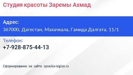 Студия красоты Заремы Ахмад по адресу 367000, Дагестан, Махачкала, Гамида Далгата, 11/1 в дальнейшем Организация, размещена в следующих категориях: