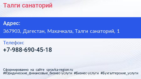 Талги, санаторий по адресу 367903, Дагестан, Махачкала, Талги санаторий, 1 в дальнейшем Организация, размещена в следующих категориях: