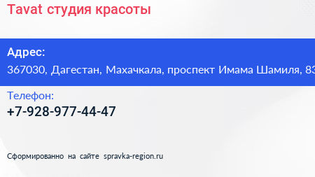 Tavat, студия красоты по адресу 367030, Дагестан, Махачкала, проспект Имама Шамиля, 83 в дальнейшем Организация, размещена в следующих категориях: