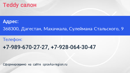 Teddy, салон по адресу 368300, Дагестан, Махачкала, Сулеймана Стальского, 9 в дальнейшем Организация, размещена в следующих категориях: