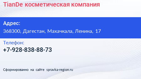 TianDe, косметическая компания по адресу 368300, Дагестан, Махачкала, Ленина, 17 в дальнейшем Организация, размещена в следующих категориях: