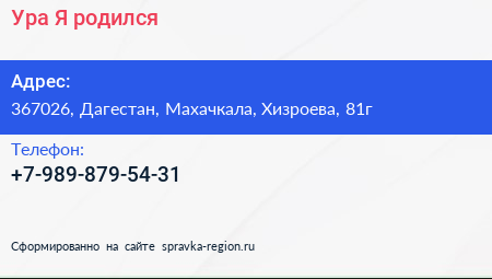 Ура!Я родился! по адресу 367026, Дагестан, Махачкала, Хизроева, 81г в дальнейшем Организация, размещена в следующих категориях: