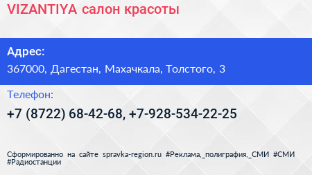 VIZANTIYA, салон красоты по адресу 367000, Дагестан, Махачкала, Толстого, 3 в дальнейшем Организация, размещена в следующих категориях:
