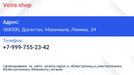 Veira shop по адресу 368300, Дагестан, Махачкала, Ленина, 24 в дальнейшем Организация, размещена в следующих категориях: