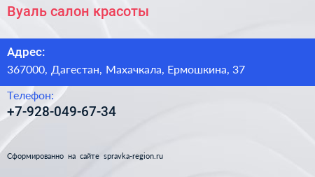 Вуаль, салон красоты по адресу 367000, Дагестан, Махачкала, Ермошкина, 37 в дальнейшем Организация, размещена в следующих категориях: