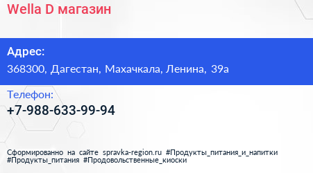 Wella-D, магазин по адресу 368300, Дагестан, Махачкала, Ленина, 39а в дальнейшем Организация, размещена в следующих категориях: