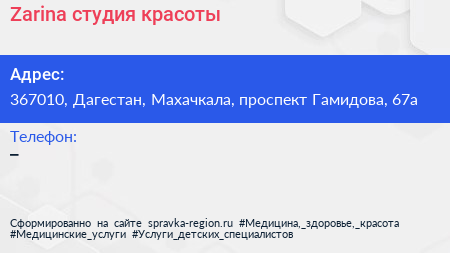 Zarina, студия красоты по адресу 367010, Дагестан, Махачкала, проспект Гамидова, 67а в дальнейшем Организация, размещена в следующих категориях: