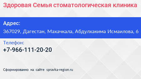 Здоровая Семья, стоматологическая клиника по адресу 367029, Дагестан, Махачкала, Абдулхакима Исмаилова, 6 в дальнейшем Организация, размещена в следующих категориях:
