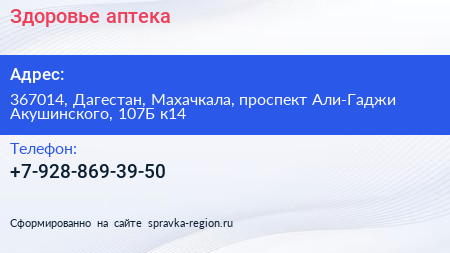 Здоровье, аптека по адресу 367014, Дагестан, Махачкала, проспект Али-Гаджи Акушинского, 107Б к14 в дальнейшем Организация, размещена в следующих категориях: