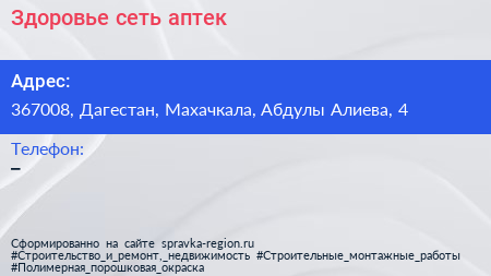 Здоровье, сеть аптек по адресу 367008, Дагестан, Махачкала, Абдулы Алиева, 4 в дальнейшем Организация, размещена в следующих категориях: