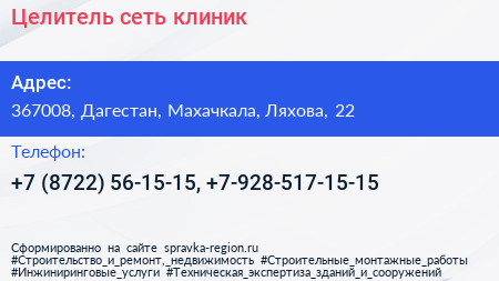 Целитель, сеть клиник по адресу 367008, Дагестан, Махачкала, Ляхова, 22 в дальнейшем Организация, размещена в следующих категориях: