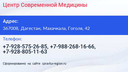 Центр Современной Медицины по адресу 367008, Дагестан, Махачкала, Гоголя, 42 в дальнейшем Организация, размещена в следующих категориях: