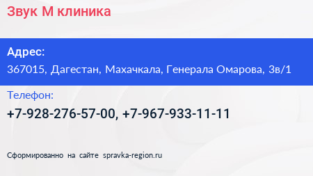 Звук-М, клиника по адресу 367015, Дагестан, Махачкала, Генерала Омарова, 3в/1 в дальнейшем Организация, размещена в следующих категориях: