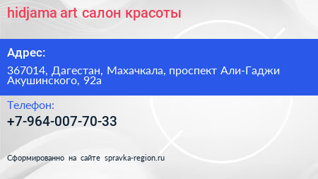 hidjama art, салон красоты по адресу 367014, Дагестан, Махачкала, проспект Али-Гаджи Акушинского, 92а в дальнейшем Организация, размещена в следующих категориях: