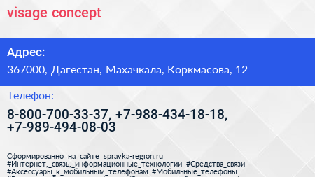 visage.concept по адресу 367000, Дагестан, Махачкала, Коркмасова, 12 в дальнейшем Организация, размещена в следующих категориях: