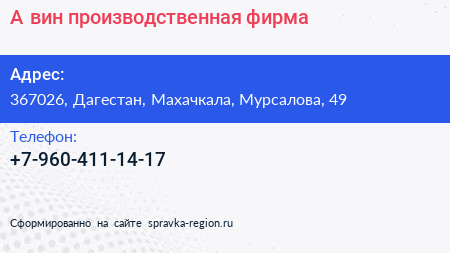 А-вин, производственная фирма по адресу 367026, Дагестан, Махачкала, Мурсалова, 49 в дальнейшем Организация, размещена в следующих категориях: