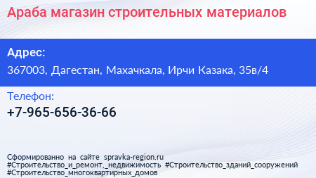Араба, магазин строительных материалов по адресу 367003, Дагестан, Махачкала, Ирчи Казака, 35в/4 в дальнейшем Организация, размещена в следующих категориях: