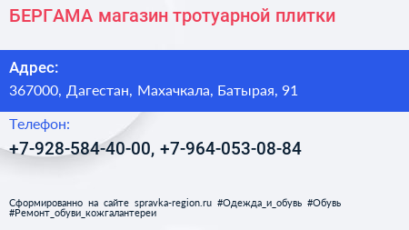 БЕРГАМА, магазин тротуарной плитки по адресу 367000, Дагестан, Махачкала, Батырая, 91 в дальнейшем Организация, размещена в следующих категориях: