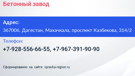 Бетонный завод по адресу 367006, Дагестан, Махачкала, проспект Казбекова, 314/2 в дальнейшем Организация, размещена в следующих категориях: