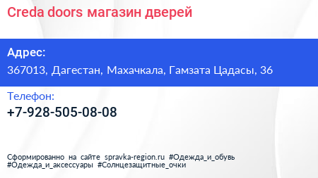 Creda doors, магазин дверей по адресу 367013, Дагестан, Махачкала, Гамзата Цадасы, 36 в дальнейшем Организация, размещена в следующих категориях: