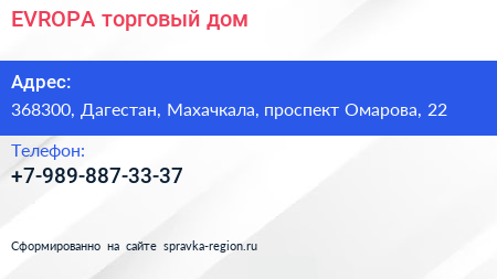 EVROPA, торговый дом по адресу 368300, Дагестан, Махачкала, проспект Омарова, 22 в дальнейшем Организация, размещена в следующих категориях: