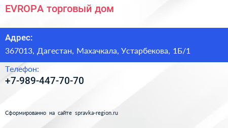 EVROPA, торговый дом по адресу 367013, Дагестан, Махачкала, Устарбекова, 1Б/1 в дальнейшем Организация, размещена в следующих категориях: