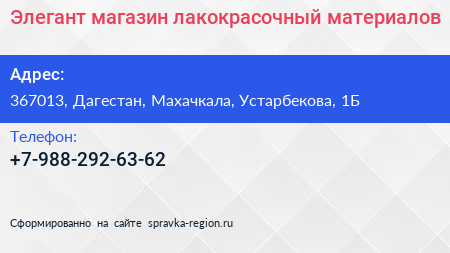 Элегант, магазин лакокрасочный материалов по адресу 367013, Дагестан, Махачкала, Устарбекова, 1Б в дальнейшем Организация, размещена в следующих категориях: