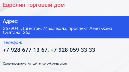 Евролин, торговый дом по адресу 367904, Дагестан, Махачкала, проспект Амет-Хана Султана, 26а в дальнейшем Организация, размещена в следующих категориях: