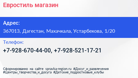 Евростиль, магазин по адресу 367013, Дагестан, Махачкала, Устарбекова, 1/20 в дальнейшем Организация, размещена в следующих категориях: