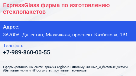 ExpressGlass, фирма по изготовлению стеклопакетов по адресу 367006, Дагестан, Махачкала, проспект Казбекова, 191 в дальнейшем Организация, размещена в следующих категориях: