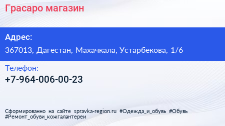 Грасаро, магазин по адресу 367013, Дагестан, Махачкала, Устарбекова, 1/6 в дальнейшем Организация, размещена в следующих категориях: