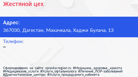Жестяной цех по адресу 367030, Дагестан, Махачкала, Хаджи Булача, 13 в дальнейшем Организация, размещена в следующих категориях: