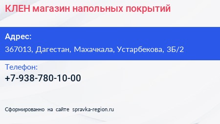 КЛЕН, магазин напольных покрытий по адресу 367013, Дагестан, Махачкала, Устарбекова, 3Б/2 в дальнейшем Организация, размещена в следующих категориях: