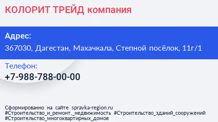 КОЛОРИТ ТРЕЙД, компания по адресу 367030, Дагестан, Махачкала, Степной посёлок, 11г/1 в дальнейшем Организация, размещена в следующих категориях: