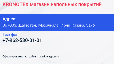 KRONOTEX, магазин напольных покрытий по адресу 367003, Дагестан, Махачкала, Ирчи Казака, 31/6 в дальнейшем Организация, размещена в следующих категориях: