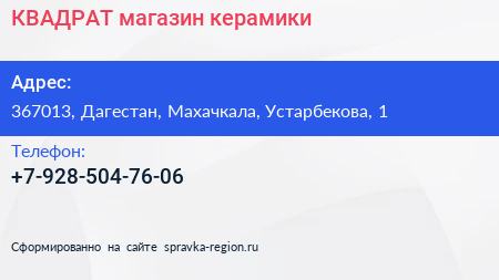 КВАДРАТ, магазин керамики по адресу 367013, Дагестан, Махачкала, Устарбекова, 1 в дальнейшем Организация, размещена в следующих категориях: