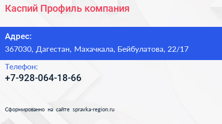 Каспий Профиль, компания по адресу 367030, Дагестан, Махачкала, Бейбулатова, 22/17 в дальнейшем Организация, размещена в следующих категориях: