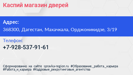 Каспий, магазин дверей по адресу 368300, Дагестан, Махачкала, Орджоникидзе, 3/19 в дальнейшем Организация, размещена в следующих категориях: