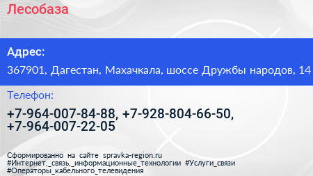 Лесобаза по адресу 367901, Дагестан, Махачкала, шоссе Дружбы народов, 14 в дальнейшем Организация, размещена в следующих категориях: