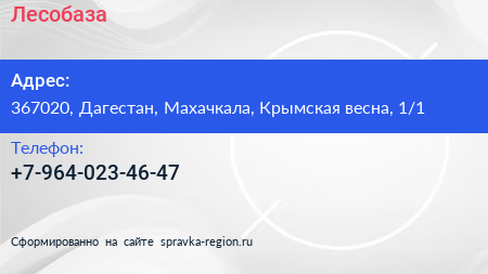 Лесобаза по адресу 367020, Дагестан, Махачкала, Крымская весна, 1/1 в дальнейшем Организация, размещена в следующих категориях: