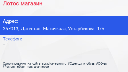 Лотос, магазин по адресу 367013, Дагестан, Махачкала, Устарбекова, 1/6 в дальнейшем Организация, размещена в следующих категориях: