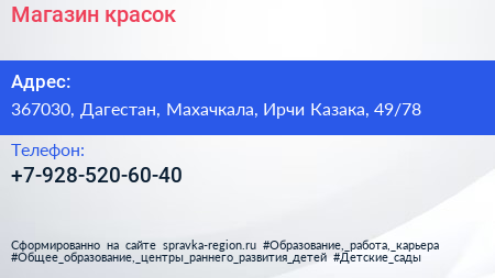 Магазин красок по адресу 367030, Дагестан, Махачкала, Ирчи Казака, 49/78 в дальнейшем Организация, размещена в следующих категориях:
