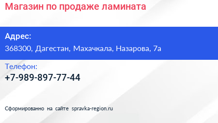 Магазин по продаже ламината по адресу 368300, Дагестан, Махачкала, Назарова, 7а в дальнейшем Организация, размещена в следующих категориях: