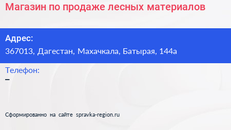 Магазин по продаже лесных материалов по адресу 367013, Дагестан, Махачкала, Батырая, 144а в дальнейшем Организация, размещена в следующих категориях:
