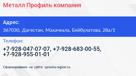 Металл Профиль, компания по адресу 367030, Дагестан, Махачкала, Бейбулатова, 28а/1 в дальнейшем Организация, размещена в следующих категориях:
