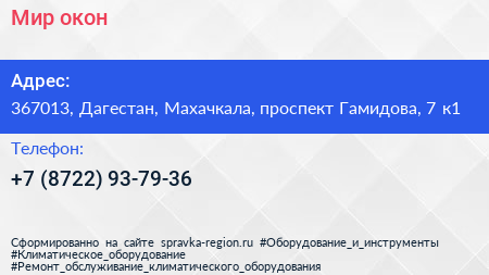 Мир oкон по адресу 367013, Дагестан, Махачкала, проспект Гамидова, 7 к1 в дальнейшем Организация, размещена в следующих категориях: