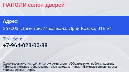 НАПОЛИ, салон дверей по адресу 367003, Дагестан, Махачкала, Ирчи Казака, 31Б к1 в дальнейшем Организация, размещена в следующих категориях:
