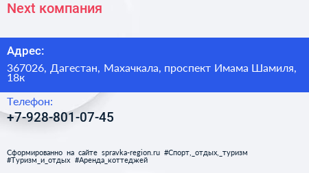 Next, компания по адресу 367026, Дагестан, Махачкала, проспект Имама Шамиля, 18к в дальнейшем Организация, размещена в следующих категориях: