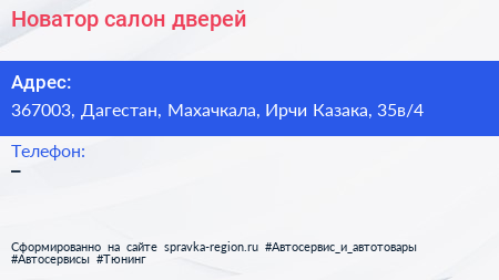Новатор, салон дверей по адресу 367003, Дагестан, Махачкала, Ирчи Казака, 35в/4 в дальнейшем Организация, размещена в следующих категориях: