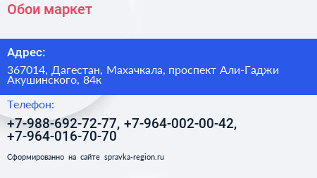 Обои маркет по адресу 367014, Дагестан, Махачкала, проспект Али-Гаджи Акушинского, 84к в дальнейшем Организация, размещена в следующих категориях: